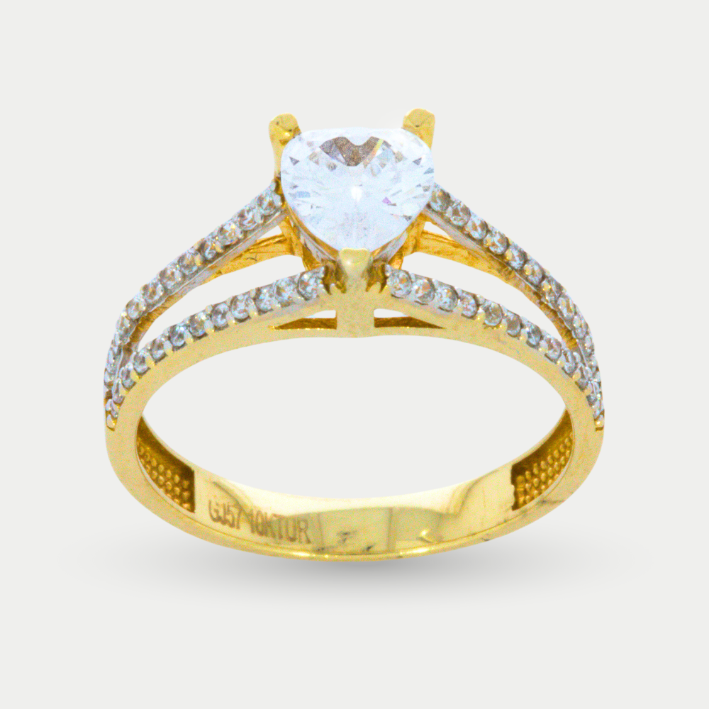 Anillo con una zirconia al centro en forma de corazon, y pequeñas zirconias a los costados. Medida: 7.5 Peso: 2.6 gramos. SKU: 0609-1S-4892-2.6