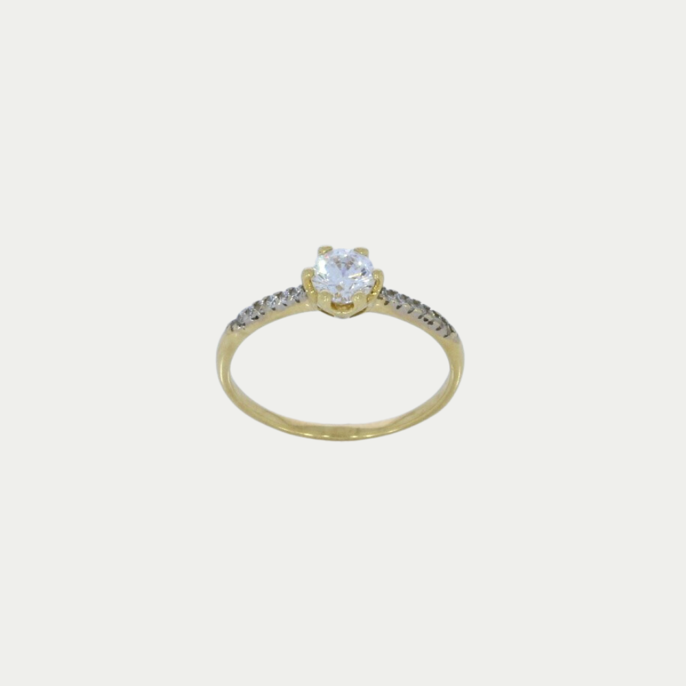 Hecho en oro amarillo con una zirconia redonda de color blanca al centro, y pequeñas zirconias redondas de color blancas a los costados, diseño delgado pero hermoso, lúcelo con cualquier outfit de tu preferencia, montura baja para que la piedra central no sobresalga demasiado, esto hace ver el anillo sencillo, pero sin dejar de ser elegante. Medida: 6.5 Peso: 2.2 gramos. SKU: 0642-1S-3190-22