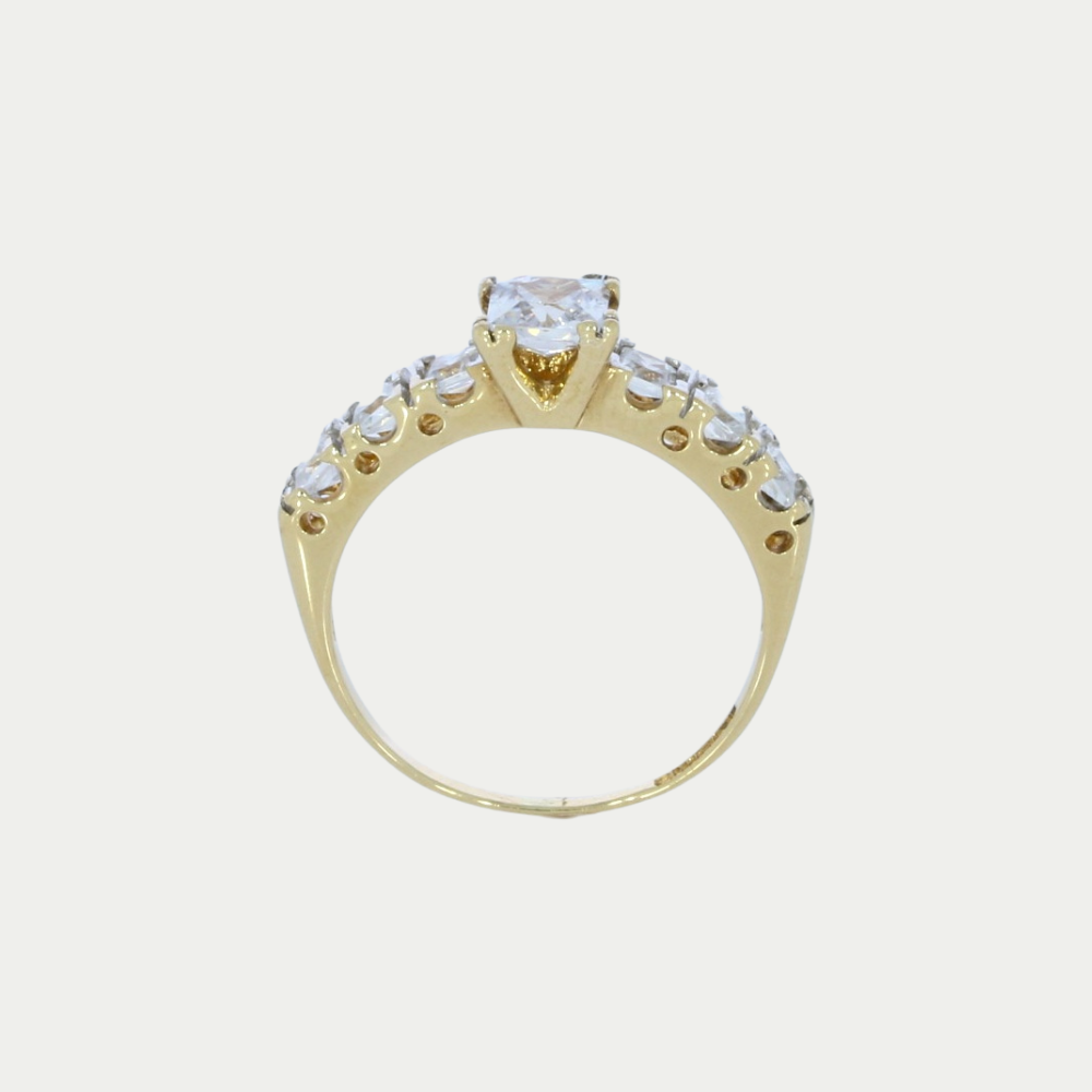 Solitario en oro amarillo con una zirconia en la parte central de color blanca, pequeñas en los costados. Medida: 8.5 Peso: 2.6 gramos. SKU: 06111SOLI2970