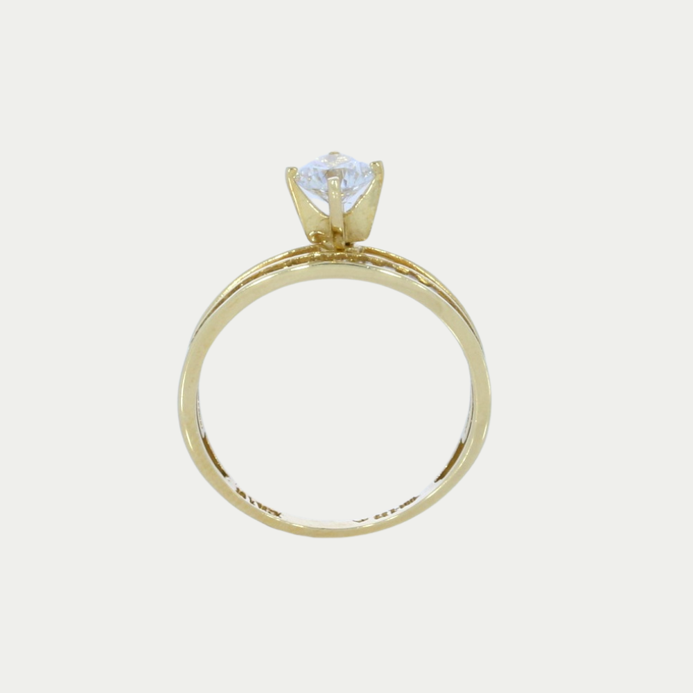 Solitario en oro blanco con una zirconia en la parte central de color blanca, pequeñas a los costados. Medida: 8.5 Peso: 2.1 gramos. SKU: 0611-1S-3045