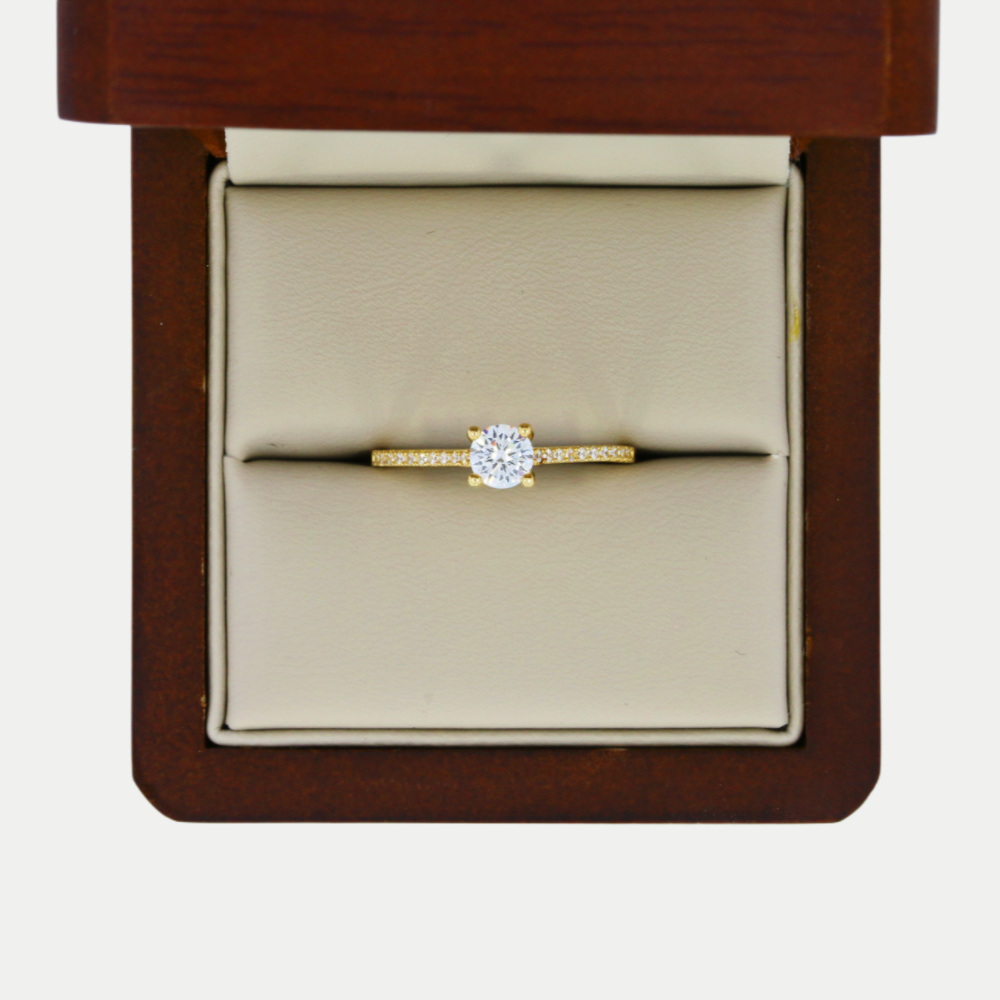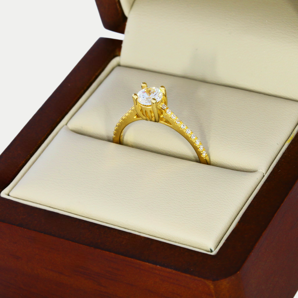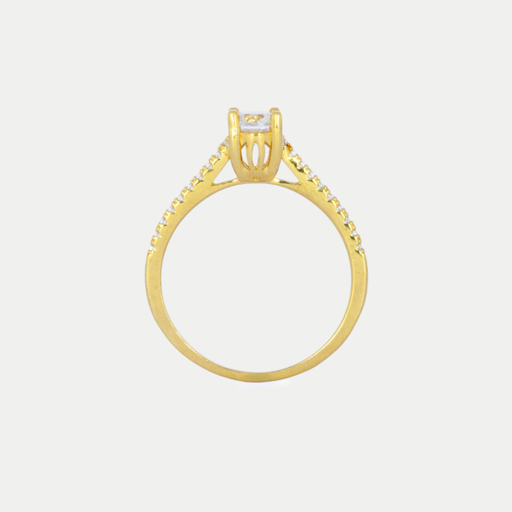 Hecho en oro amarillo con zirconias, una grande al centro y pequeñas a los costados que cubren la mitad del cuerpo del anillo. Medida: #8.0 Peso: 1.9gr. SKU: 06091S5680-1