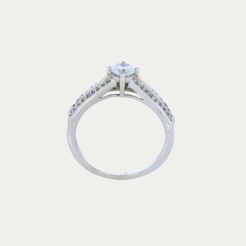 Solitario en oro blanco con una zirconia en la parte central de color blanca, pequeñas a los costados. Medida: 8.0 Peso: 3.9 gramos. SKU: 0616-2S-7215