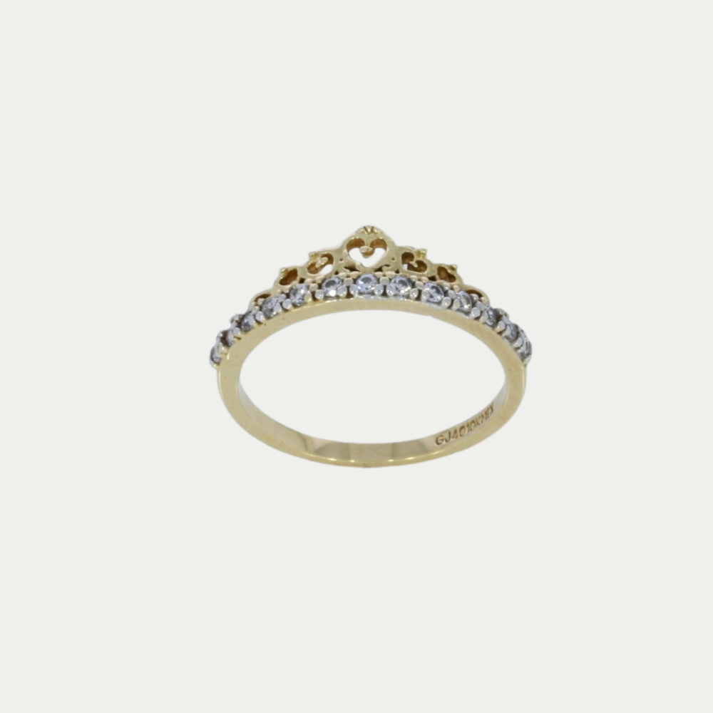 Hecho en oro amarillo con figura de coronita, una línea con pequeñas zirconias redondas de color blancas en la base, y en 3 de sus picos cuenta con pequeñas zirconias redondas de color blancas, hermoso diseño para quinceañera, sin problema puede combinarlo con cualquier outfit. Medida: 7.5 Peso: 2.1 gramos. SKU: 06111COROZA2.2