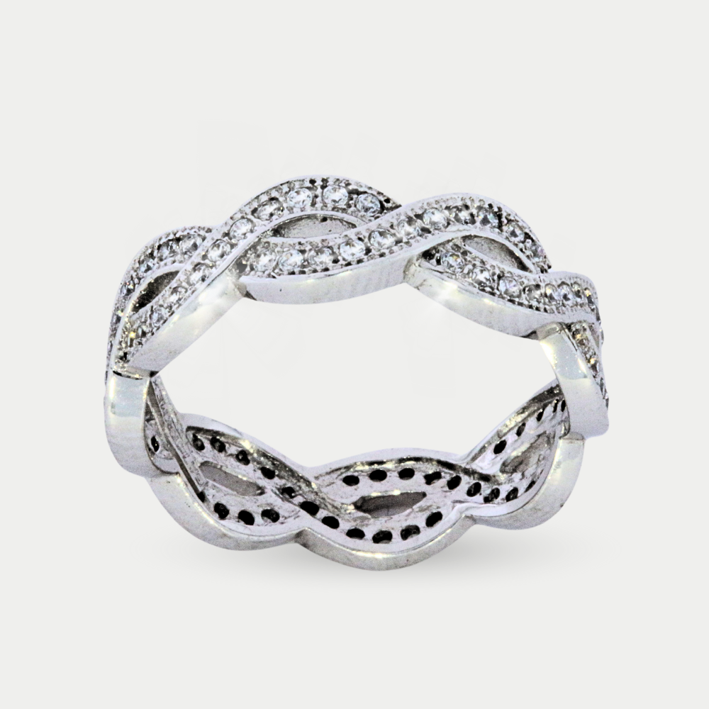 Hecha en oro blanco en forma de trenzado, cubierto con pequeñas zirconias de color blancas. Medida: 6.5. Peso: 3.3 gramos. SKU: 06DN2C86001