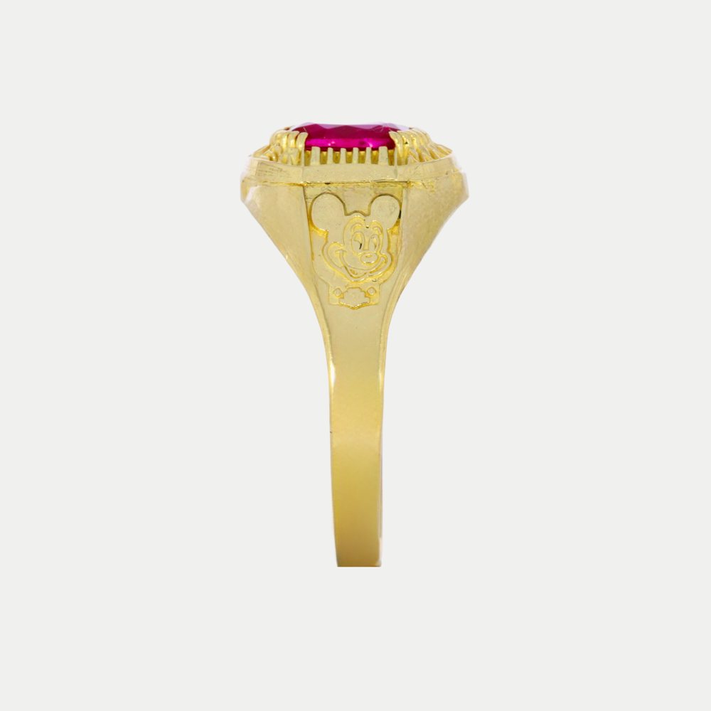 Hecho en oro amarillo con una zirconia de color al centro, bisel grabado con la palabra "Kínder", imagen de Mickey Mouse a un costado, y al otro la figura de una maestra junto a un pizarrón, hermoso diseño unisex, celebra el éxito de sus hijos con nuestros modelos de graduación. Medida: 1.0 a 5.0 SKU: 09KPEX. Consultar por WhatsApp disponibilidad de color de piedra y para cotizar otras medidas de anillo.