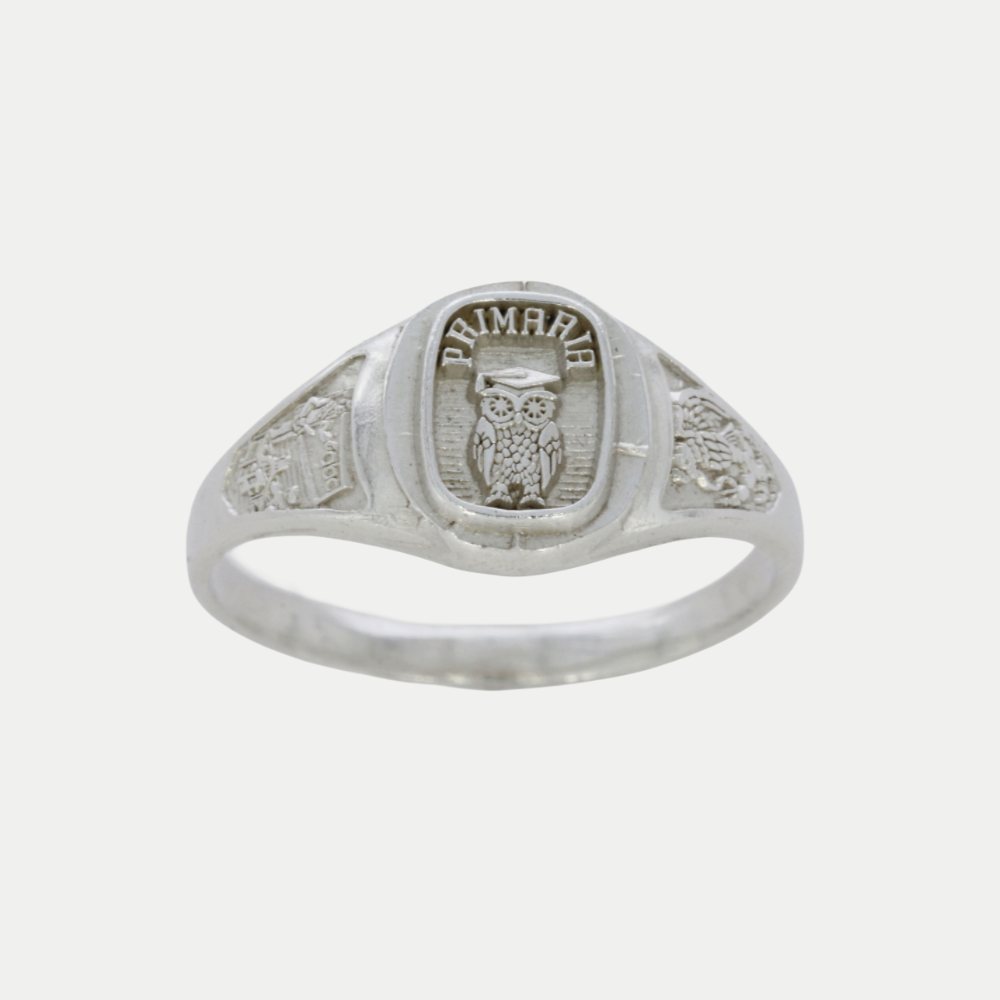 Hecho en Plata .925 con la figura de un Búho en la parte de enfrente junto con la palabra "Primaria", a un costado tiene la figura de una maestra y un pizarrón, al otro costado tiene la imagen de un Águila, hermoso diseño unisex, celebra el éxito de sus hijos con nuestros modelos de graduación. Medida 10.5 SKU: 09PB299