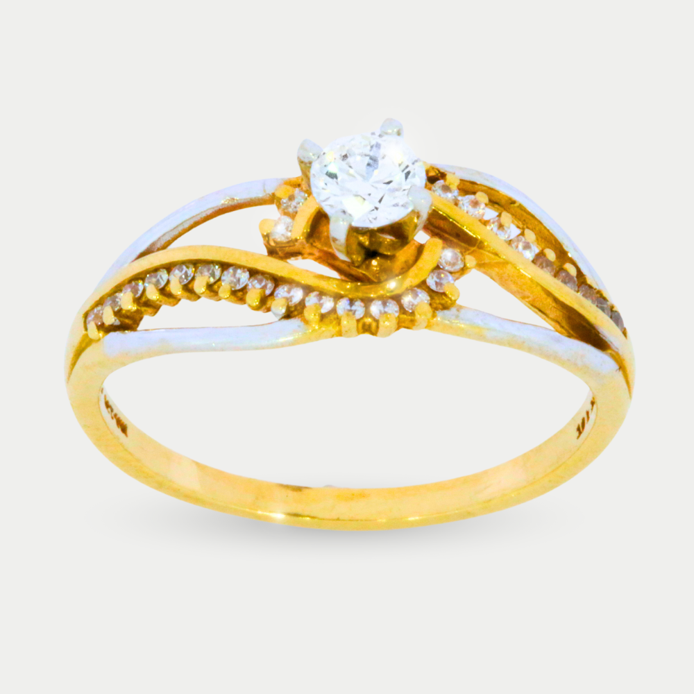 Solitario en oro amarillo con una zirconia en la parte central, pequeñas zirconias en los costados. Medida: 7.5 Peso: 2.3 gramos. SKU: 06001SOLI2875