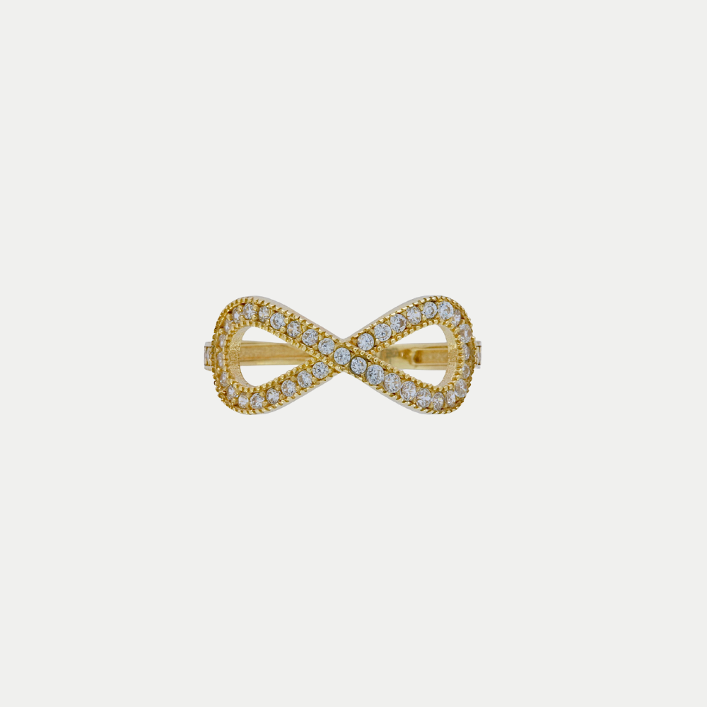 Hecho en oro amarillo con figura del infinito cubierto con pequeñas zirconias de color blancas y 4 pequeñas en ambos costados, cuerpo en acabado pulido, diseño sencillo pero perfecto para usar en cualquier ocasión y con cualquier outfit de su preferencia. Medida: 6.0 Peso: 1.4 gramos SKU: 06BO1AN22401