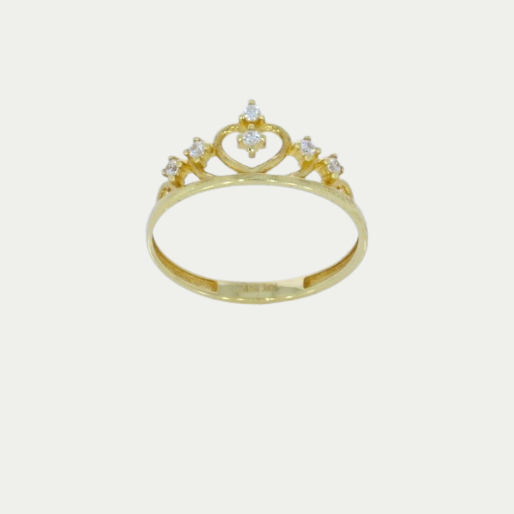 Anillo en oro amarillo con una figura de coronita, silueta de un corazon al centro. Medida: 7.0 Peso: 1.0 gramos. SKU: 06GC-1D-1750