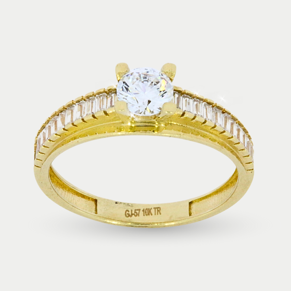 Hecho en oro amarillo con una zirconia redonda en la parte central, pequeñas zirconias baguette blancas en los costados con bisel liso que hace ver la parte superior del anillo ancha, diseño atemporal, excelente modelo para lucirlo con cualquier outfit. Medida: 7.0 Peso: 2.2 gramos. SKU: 0609-1S-4180-22