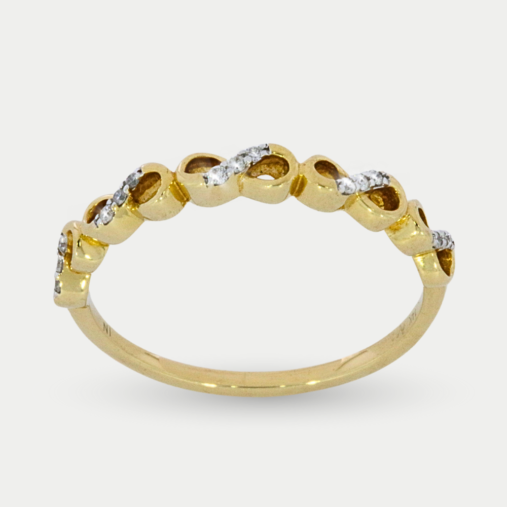 Hecho en oro amarillo cubriendo la mitad superior del cuerpo de anillo por figuras del infinito, cuentan con 3 piedritas de diamante corte brillante en cada infinito con un total de 0.05 puntos, acabado liso por la parte inferior del anillo, hermoso diseño atemporal que sin duda es un excelente modelo para llevarlo a cualquier evento especial o para su uso diario, incluye su certificado de autenticidad de los diamantes. Medida: 7.0 Peso: 1.5 gramos. SKU: 1690-2CHUR-7000