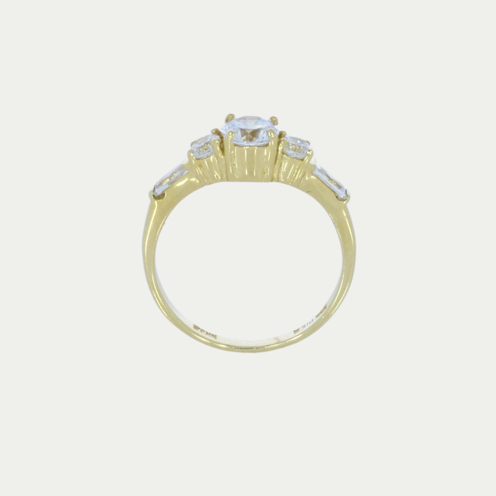 Solitario en oro amarillo con una zirconia de color blanca en el centro, una redonda y una rectangular en cada costado. Medida: 5.5 Peso: 2.3 gramos. SKU: 0642-1F-4059