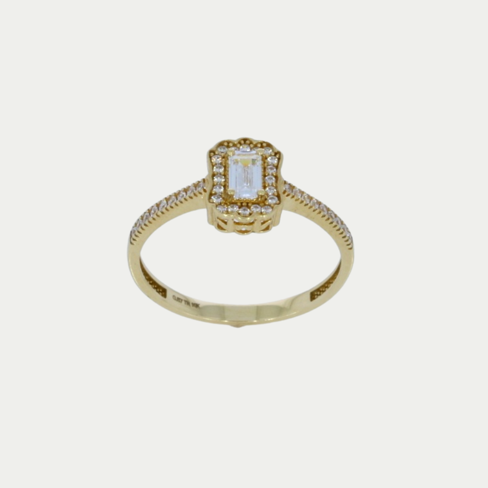 Hecho en oro amarillo con una zirconia rectangular blanca al centro, bisel con pequeñas zirconias blancas redondas, al igual que sus costados cuenta con pequeñas zirconias redondas de color blancas, hermosa montura con figuras que hará lucir de una manera especial su anillo, combínelo con cualquier outfit de su preferencia. Medida: 9.0 Peso: 1.9 gramos. SKU: 0609-1S-3590-199
