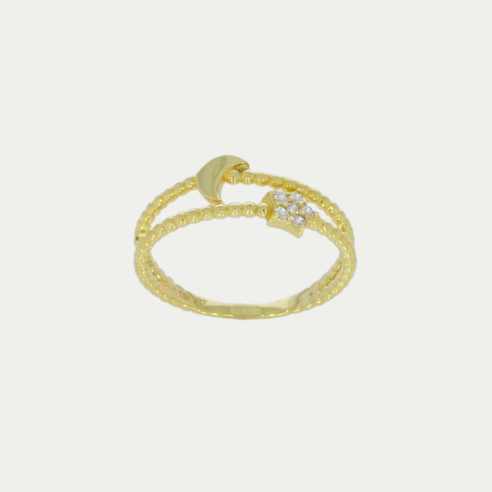 Anillo en oro amarillo con figura de una estrella cubierta con zirconias de color blancas, y una media luna. Medida: 7.0 Peso: 1.7 gramos. SKU: 06GC-1F-3145