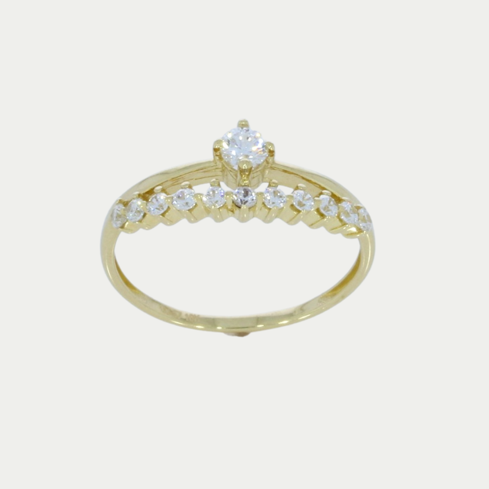Solitario en oro amarillo con una zirconia de color blanca en el centro, una linea con pequeñas zirconias a un costado. Medida: 9.5 Peso: 1.9 gramos. SKU: 0609-1SOLI-3325