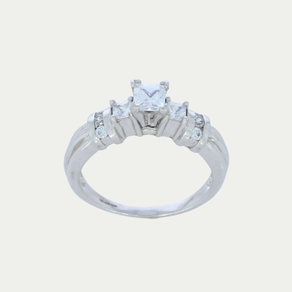 Solitario con una zirconia en el centro cuadrada de color blanca, una zirconia mediana cuadrada en cada costado, y pequeñas zirconias redondas en ambos costados. Medida: 8.0. Peso: 3.7 gramos. SKU: 0609-1S-6940