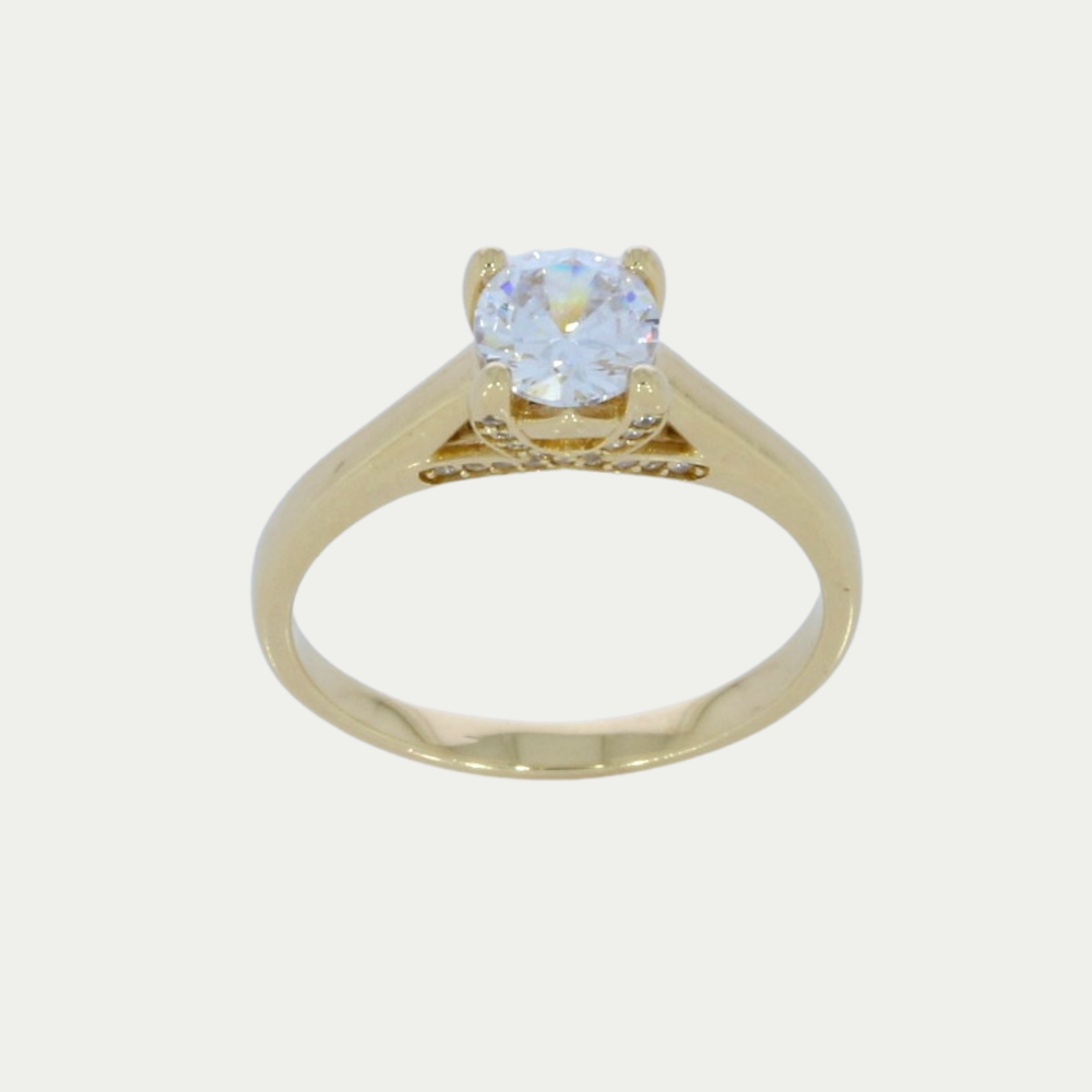 Solitario en oro amarillo con una zirconia de color blanca en la parte central, pequeñas zirconias en dos costados de la montura. Medida: 7.0 Peso: 2.8 gramos. SKU: 0609-1S-5250