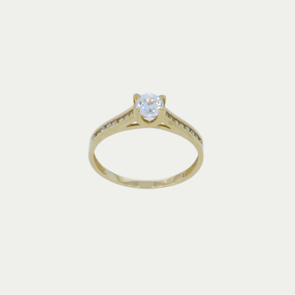 Hecho en oro amarillo con una zirconia redonda de color blanca al centro, y pequeñas zirconias redondas de color blancas a los costados, su montura alta hace resaltar aún más su piedra principal, diseño hermoso que te hará lucir muy bien con cualquier outfit, también podrás combinarlo perfectamente con cualquier otra joya. Medida: 8.0 Peso: 1.6 gramos. SKU: 0609-1S-2985-16