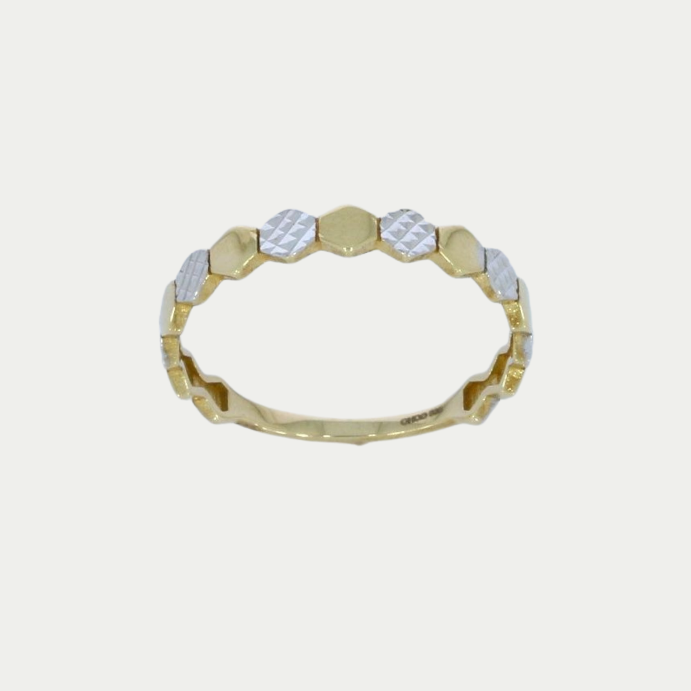Anillo con figuras hexagonales, algunas cuentan con acabado en rodio. Medida: 8.0 Peso: 1.2 gramos. SKU: 0607-8F-1920