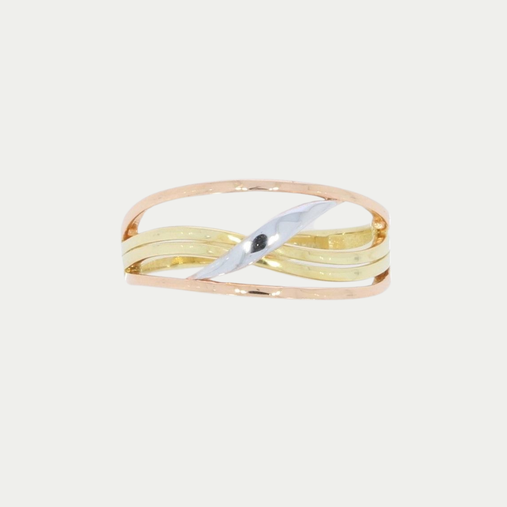 Anillo con 5 lineas al frente, dos en oro rosa, otras dos en oro amarillo, y una con acabado en rodio para dar la apariencia al oro blanco. Medida: 9.0. Peso: 2.1 gramos. SKU: 0609-1DAMA-3885-Maritza