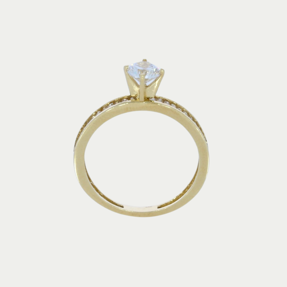 Solitario en oro amarillo con una zirconia de color blanca en la parte central, pequeñas zirconias en los costados. Medida: 6.5 Peso: 2.0 gramos. SKU: 0627-1S-3200