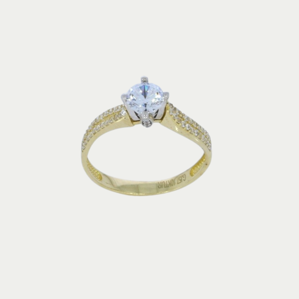 Anillo en oro amarillo con una zirconia en la parte central, pequeñas a los costados. Medida: 8.5 Peso: 2.3 gramos. SKU: 0609-1S-4370