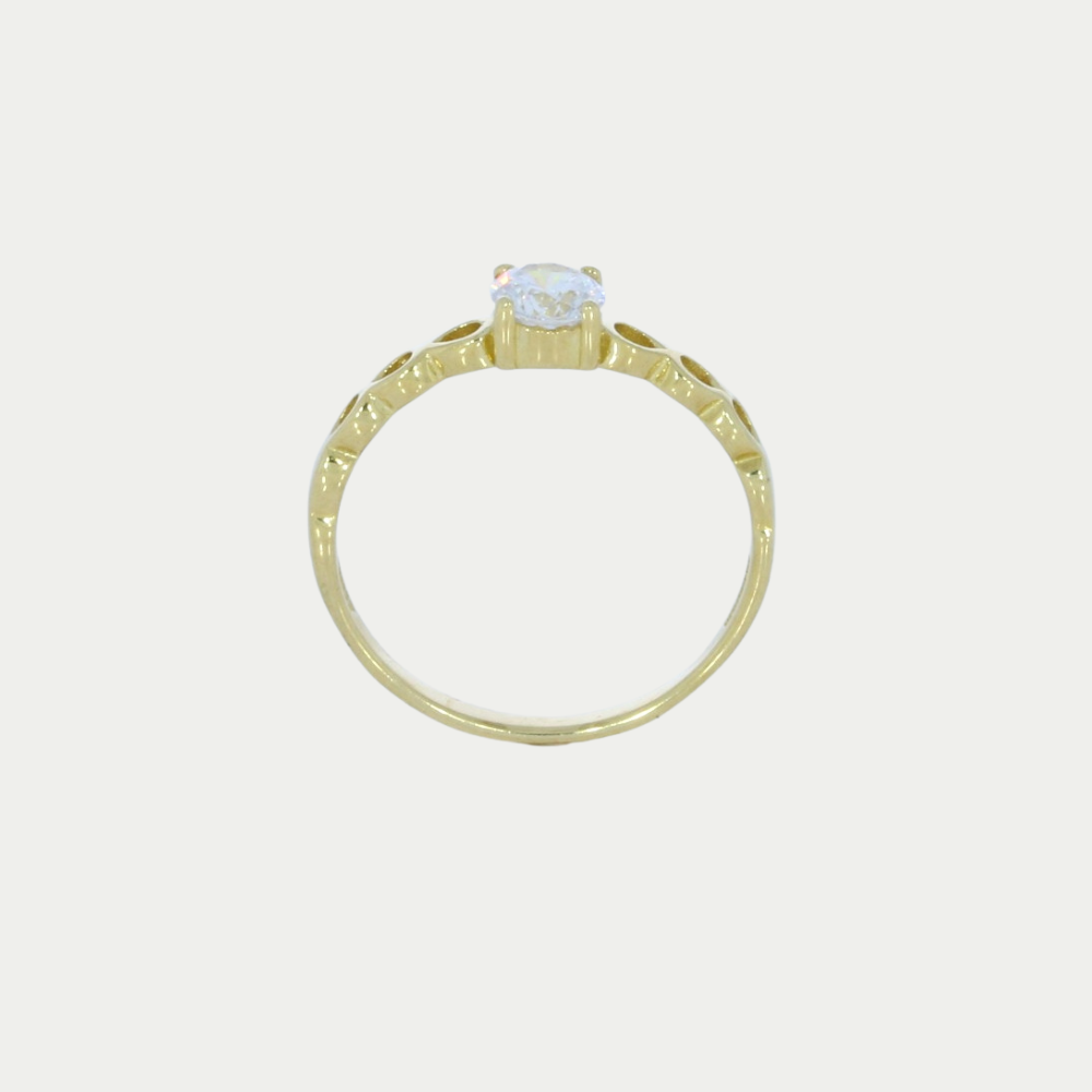 Solitario en oro amarillo con una zirconia en la parte central de color blanca, con tres figuras ovaladas en ambos costados del anillo. Medida: 8.0. Peso: 1.7 gramos. SKU: 0642-1S-2465