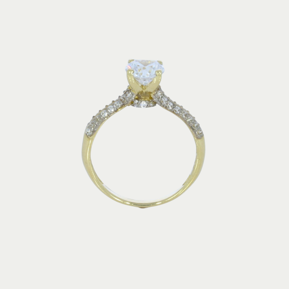 Solitario en oro amarillo con una zirconia en la parte central, y pequeñas zirconias en ambos costados. Medida: 7.0 Peso: 2.4 gramos. SKU: 0642-1S-3480