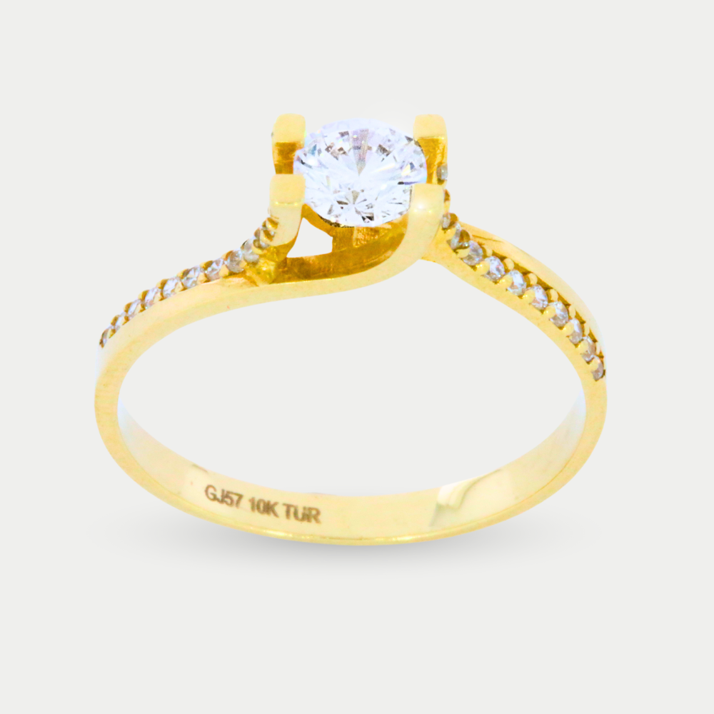 Anillo en oro amarillo con zirconia al centro, pequeñas a los costados. Medida: 8.0 Peso: 1.9 gramos. SKU: 0609-1S-3590-1.9