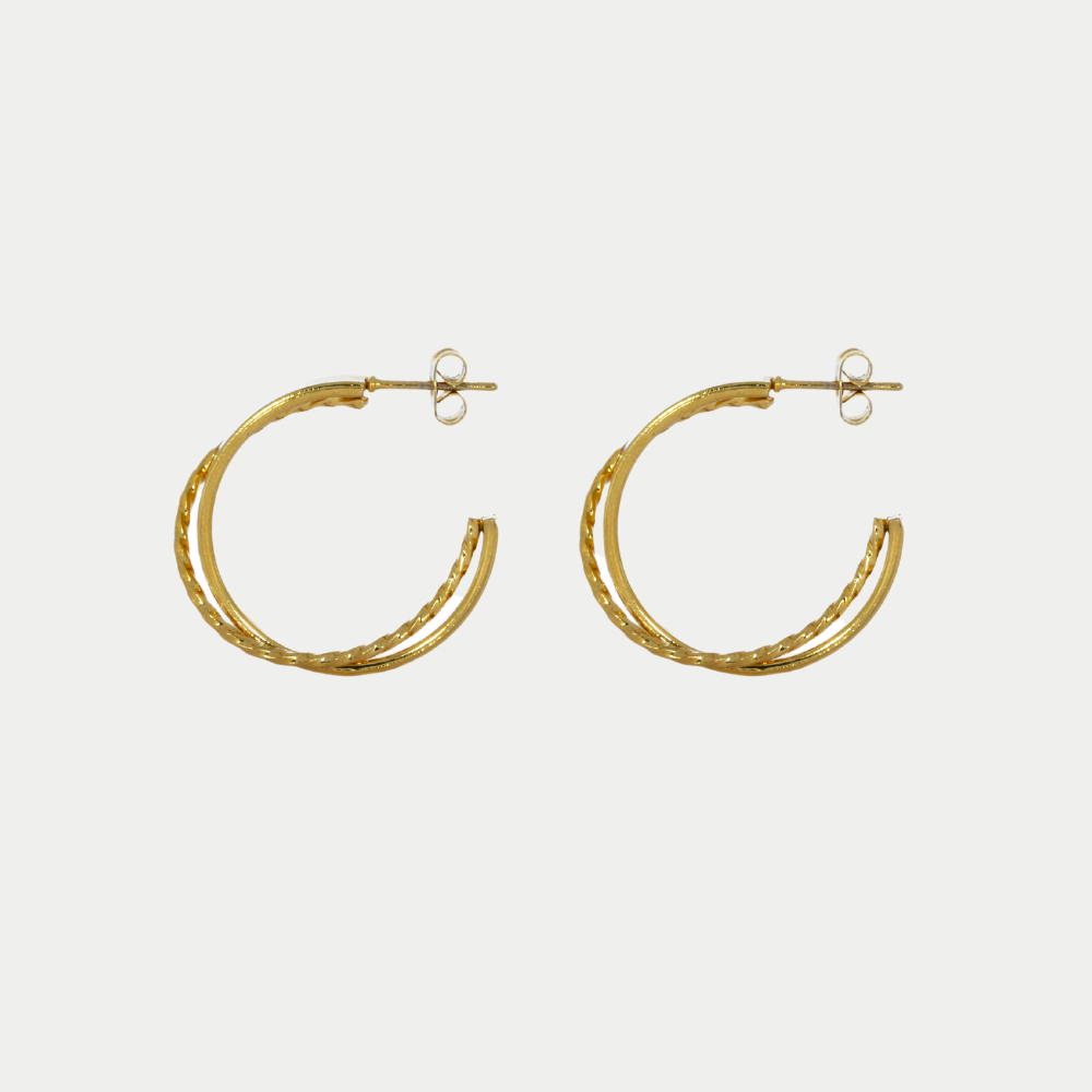 Hechas en acero inoxidable dorado con acabado liso, y una línea en forma de cuerda que rodea el cuerpo del arete, su material garantiza una larga durabilidad tanto en acabado como en su construcción. Medida: 2.5cm de alto, 4mm de ancho. SKU: 0941-AF-408-7