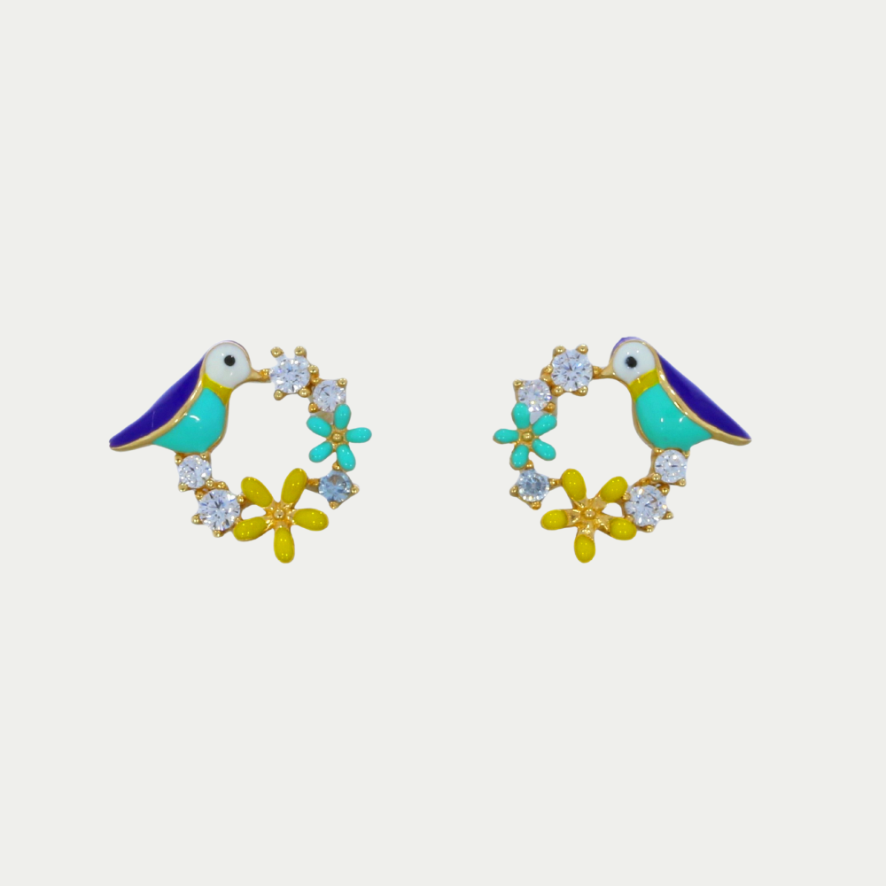 Hecho en oro amarillo con figura de un pajarito con acabado en esmalte, 5 zirconias pequeñas redondas de color blancas y dos florecitas con acabado en esmalte, hermoso modelo para llevarlo a cualquier evento especial que sin duda lucirá fantástico, nuestro oro es completamente garantizado. Medida: 1 cm de diámetro. Peso: 2.1 gramos. SKU: 0909-1F-3940