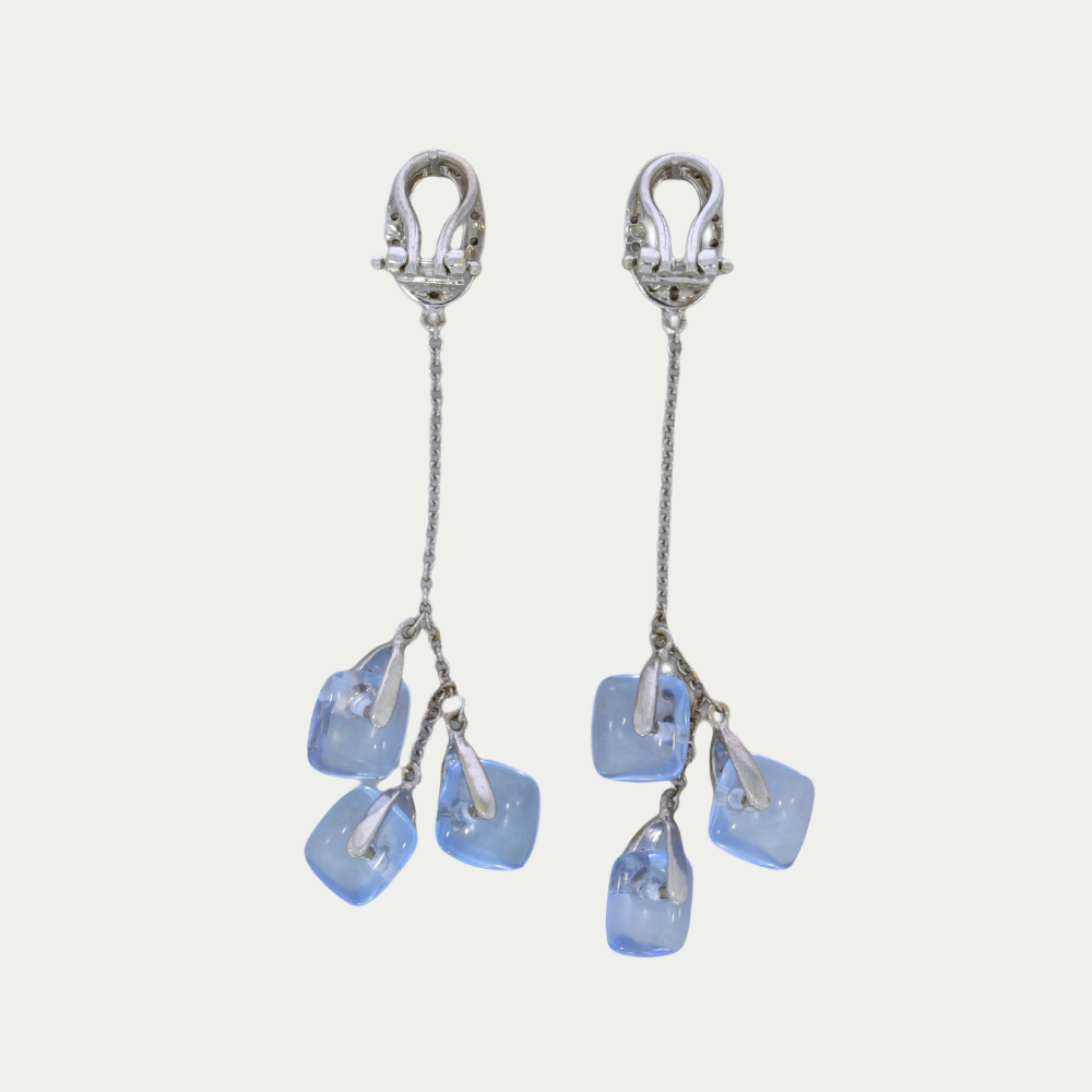 Hecho en oro blanco con figura ovalada cubierta con pequeñas zirconias redondas de color blancas, 3 cuarzos colgantes, hermoso modelo para llevarlo a cualquier evento especial que sin duda lucirá fantástico, nuestro oro es completamente garantizado. Medida: 7 cm de largo. Peso: 9.6 gramos. SKU: 09162PSAK9.6