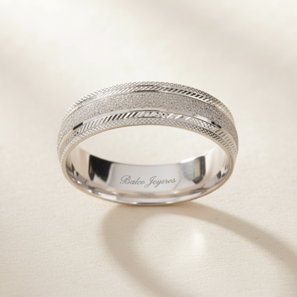 Hecha en oro blanco acabado satinado con orillas diamantadas, realizamos el grabado de nombre y fecha (letras y números) por la parte de adentro sin costo adicional. Ancho del anillo: 6mm. Mandar mensaje por WhatsApp para confirmar medidas. Tiempo de preparación de los anillos: 20 días hábiles aproximadamente, mas el tiempo de entrega de paquetería que es de 2 - 5 días hábiles aproximadamente.