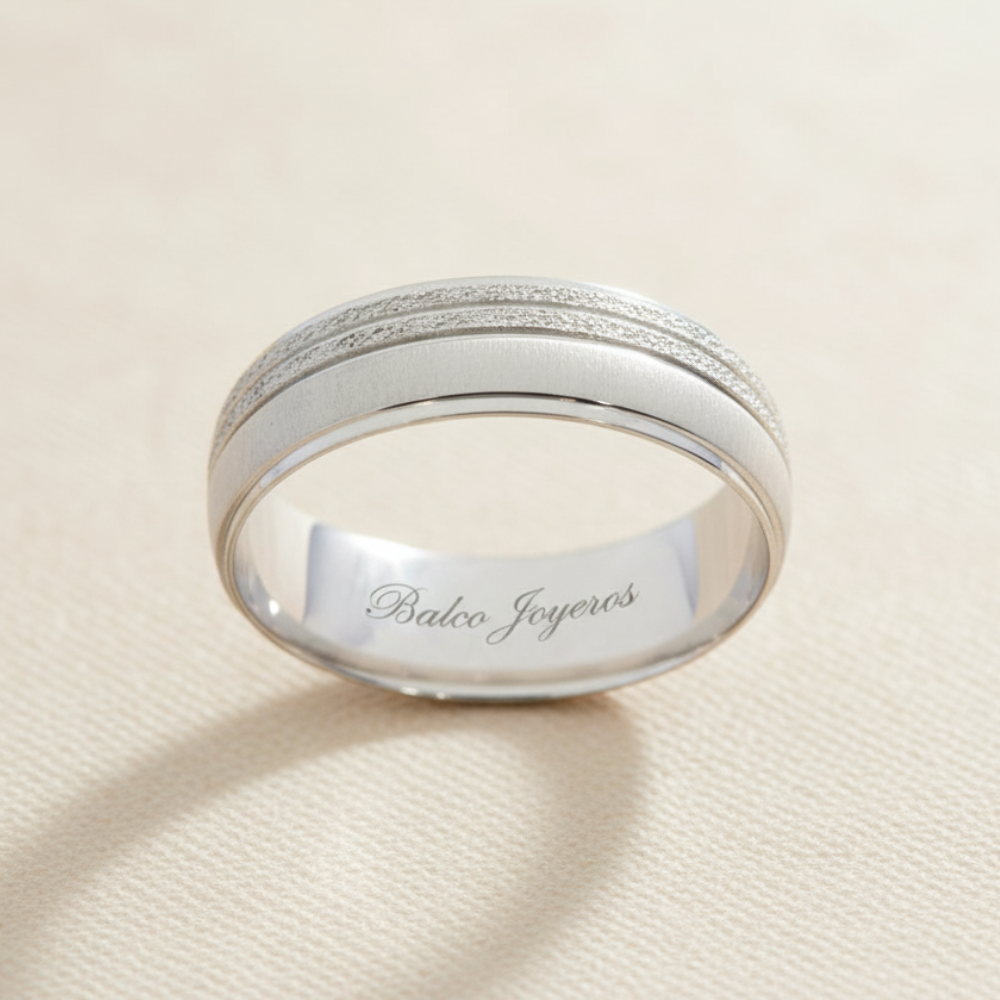 Hecha en oro blanco, con 3 líneas satinadas, realizamos el grabado de nombre y fecha (letras y números) por la parte de adentro sin costo adicional. Ancho del anillo: 6mm. Mandar mensaje por WhatsApp para confirmar medidas. Tiempo de preparación de los anillos: 20 días hábiles aproximadamente, mas el tiempo de entrega de paquetería que es de 2 - 5 días hábiles aproximadamente.