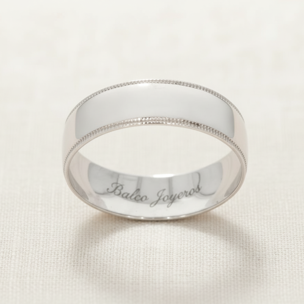 Hecha en oro blanco con acabado liso y bisel con carrucha, realizamos el grabado de nombre y fecha (letras y números) por la parte de adentro sin costo adicional. Ancho del anillo: 6mm Mandar mensaje por WhatsApp para confirmar medidas. Tiempo de preparación de los anillos: 20 días hábiles aproximadamente, mas el tiempo de entrega de paquetería que es de 2 - 5 días hábiles aproximadamente.