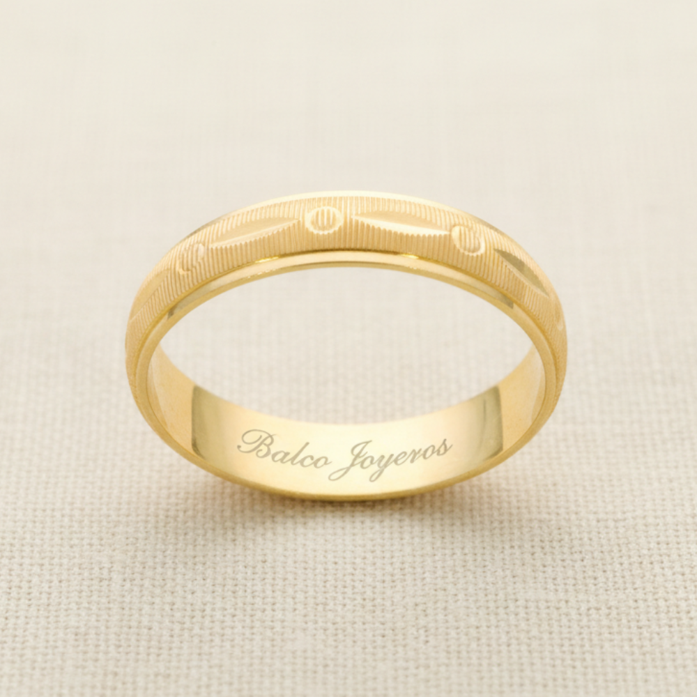 Hecha en oro amarillo satinado con líneas, figuras de rombos y círculos al rededor, realizamos el grabado de nombre y fecha (letras y números) por la parte de adentro sin costo adicional. Ancho del anillo: 4mm Mandar mensaje por WhatsApp para confirmar medidas. Tiempo de preparación de los anillos: 20 días hábiles aproximadamente, mas el tiempo de entrega de paquetería que es de 2 - 5 días hábiles aproximadamente.
