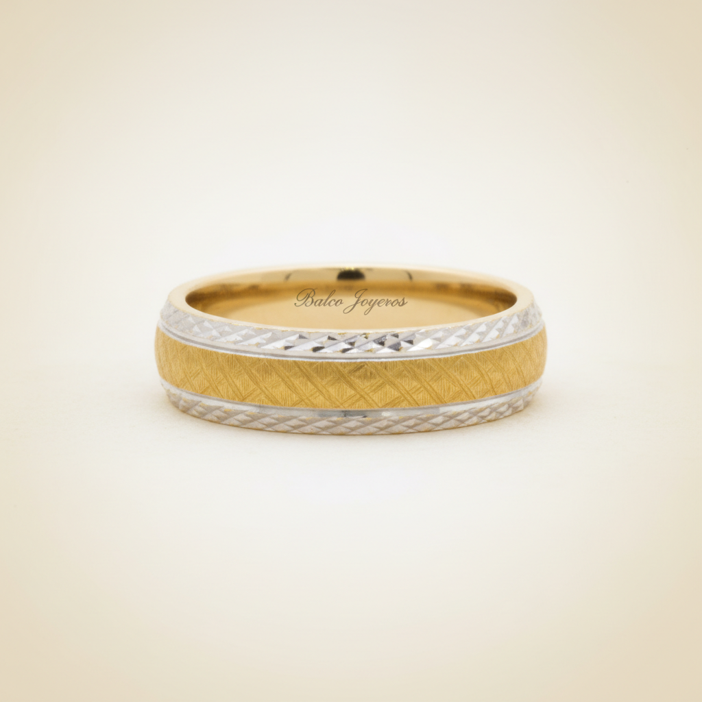 Hecha en oro amarillo con diseño diamantado, en las orillas cuenta con acabado platinado, realizamos el grabado de nombre y fecha (letras y números) por la parte de adentro sin costo adicional. Ancho del anillo: 6mm Mandar mensaje por WhatsApp para confirmar medidas. Tiempo de preparación de los anillos: 20 días hábiles aproximadamente, mas el tiempo de entrega de paquetería que es de 2 - 5 días hábiles aproximadamente.