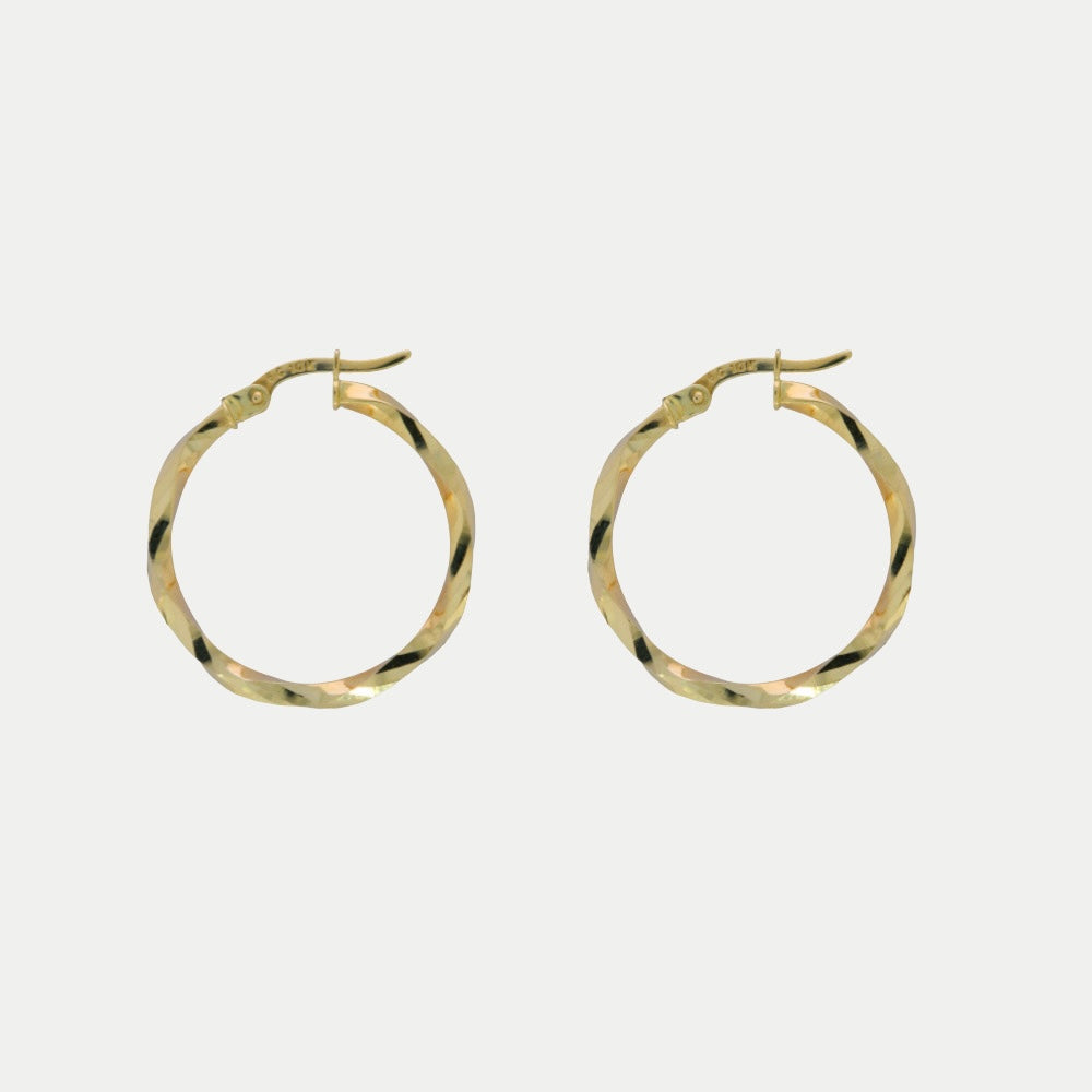 Hechas en oro amarillo en forma torzal facetada, hermoso diseño que puede lucir genial en cualquier temporada y con cualquier tipo de look. Medidas: 2.5 cm de alto, 2mm de ancho. Peso: 1.9 gr. SKU: 10GC1G32301