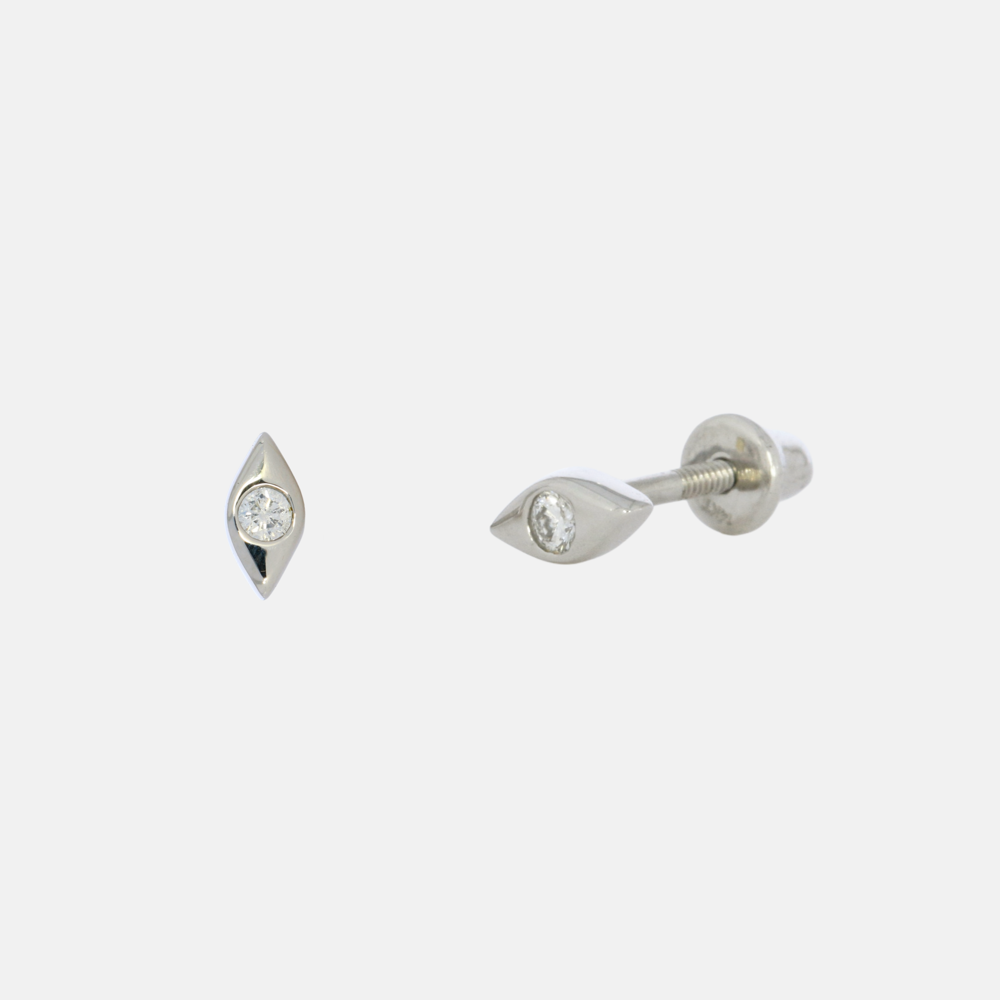 Par de broquel en oro blanco, con diamante corte brillante de 0.05 puntos y bisel ovalado liso. Broche de rosquita. Incluye certificado de autenticidad del diamante. Tamaño del bisel: 5mm de alto, 2.5mm de ancho