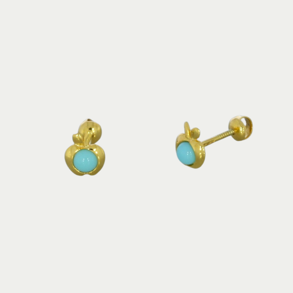 Par de broquel en oro amarillo con figura de una manzana con una piedra coral natural en el centro. SKU: 0886-2FIGU-M356