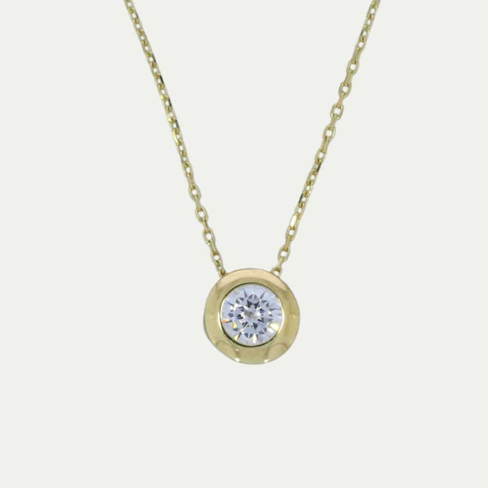 Gargantilla con una pequeña zirconia redonda de color blanca con bisel. Medida de la cadena: 42.5 cm de largo + 2.5, Tipo de broche: Redondo, Peso: 2.3 gramos. SKU: 0709-1F-4025-Beca