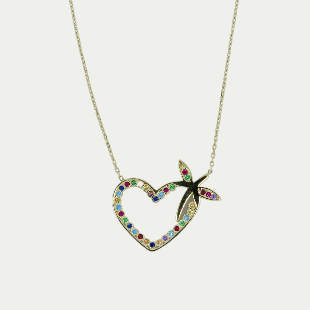 Gargantilla con dije de silueta de un corazon con una libelula, cubiertos con zircoinas pequeñas de colores. Medida de la cadena: 42.5 cm de largo + 2.5 cm. Peso: 2.8 gramos. SKU: 07GC-1GARG-4400-Carmina