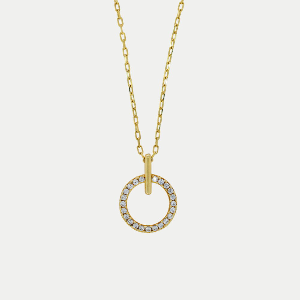 Hecha en oro amarillo con eslabon seguido con dije redondo cubierto con pequeñas zirconias de color blancas, junto con una línea lisa en la parte superior. Medida: 41 cm de largo + 2.5 cm de extencion. Peso: 2.0 gramos.
