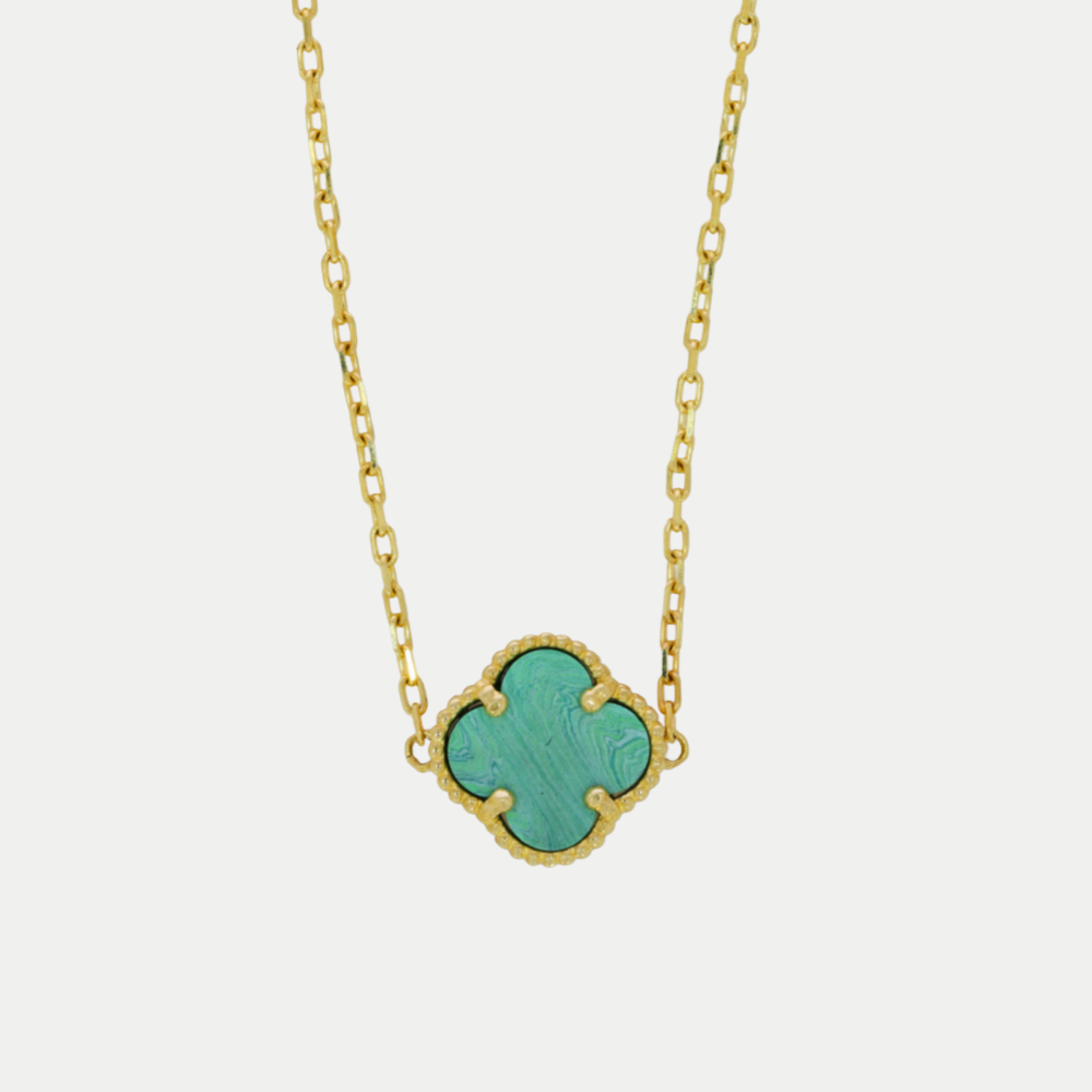 Hecha en oro amarillo, tejido eslabon seguido con dije de figura de un trebol de color verde. Medida: 43 cm de largo + 1.5 cm de extencion. Broche: Perico. Peso: 2.9 gramos