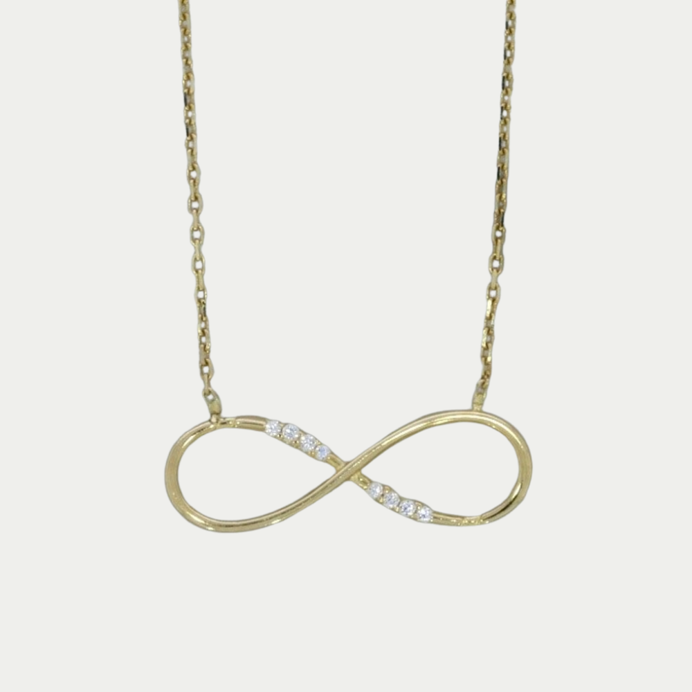 Gargantilla en oro amarillo con dije infinito, pequeñas zirconias blancas en la parte central. Medida: 42 cm de largo + 2.5 cm. Peso: 2.1 gramos. Tipo de broche: Redondo. SKU: 0709-1G-3990
