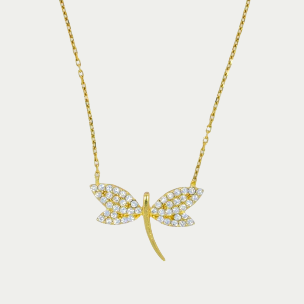 Hecha en oro amarillo con un dije de una libélula, cubriendo sus alas con pequeñas zirconias redondas de color blancas, eslabón esquicito que le da un toque discreto a la gargantilla, hermoso modelo que combinara a la perfección con cualquier outfit de su preferencia. Medida: 42 cm de largo + 1.5 cm. Peso: 2.2 gramos. Tipo de broche: Redondo. SKU: 0709-1G-4180