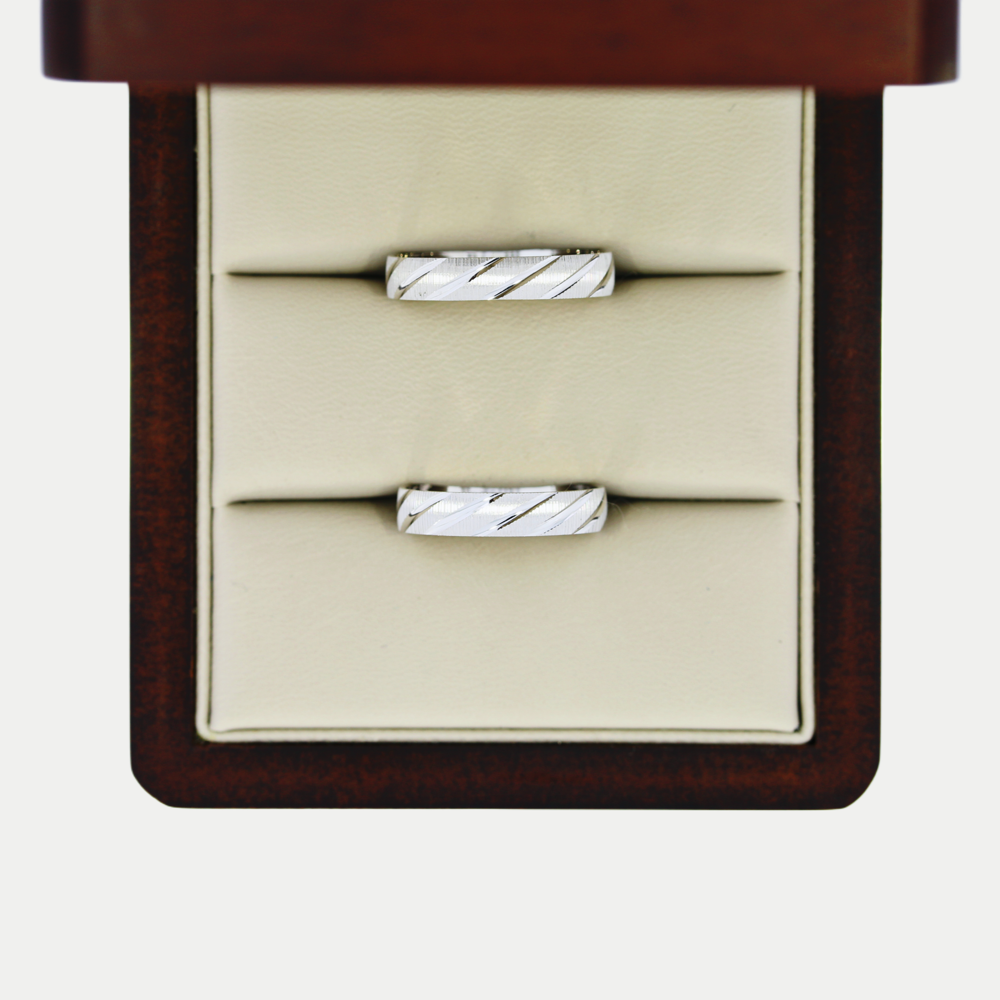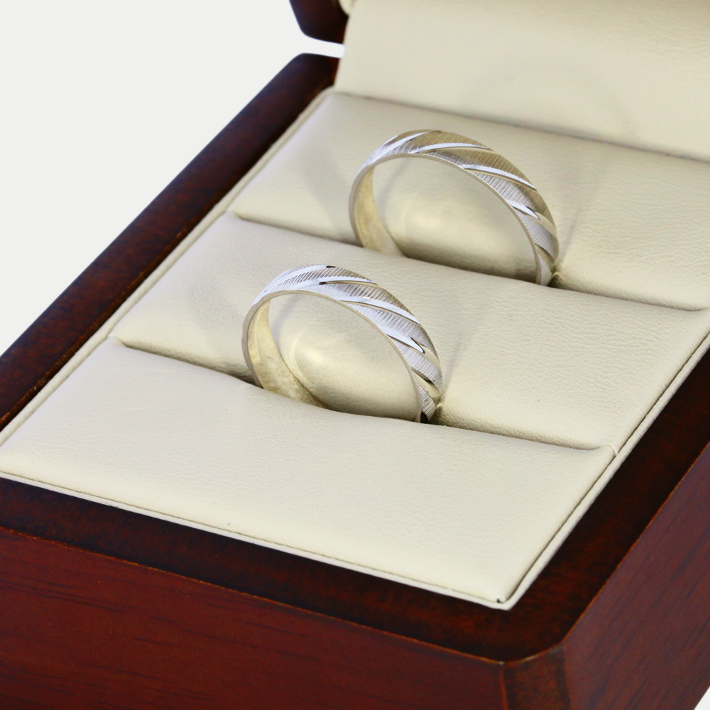 Hechas en oro blanco, acabado diamantado, realizamos el grabado de nombre y fecha (letras y números) por la parte de adentro sin costo adicional. Ancho del anillo: 4mm Precio aplica para par con medidas 6.0 y 10.0. Mandar mensaje por WhatsApp para cotizar en diferentes medidas (tiene un costo extra cuando sumando las medidas de los dos anillos da un total de 16 puntos en adelante). Tiempo de preparación de los anillos: 30 días hábiles aproximadamente, mas el tiempo de entrega de paquetería que es de 2 - 5 días hábiles aproximadamente.
