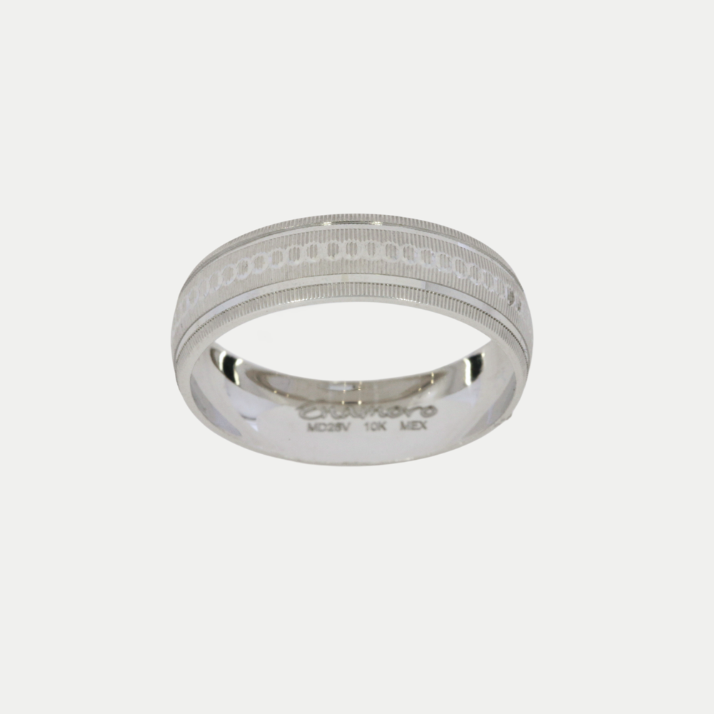 Hechas en oro blanco, una línea con circulos al rededor del anillo y dos líneas lisas, acabado de realizamos el grabado de nombre y fecha (letras y números) por la parte de adentro sin costo adicional. Ancho del anillo: 6mm Precio aplica para el par con medidas 6.0 y 10.0. Mandar mensaje por WhatsApp para cotizar en diferentes medidas (tiene un costo extra cuando sumando las medidas de los dos anillos da un total de 16 puntos en adelante). Tiempo de preparación de los anillos: 20 días hábiles aproximadamente, mas el tiempo de entrega de paquetería que es de 2 - 5 días hábiles aproximadamente.
