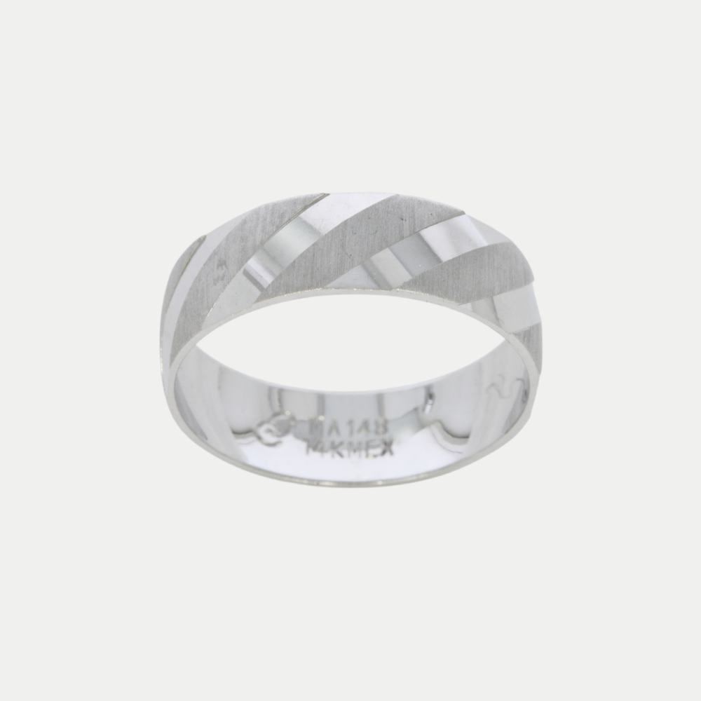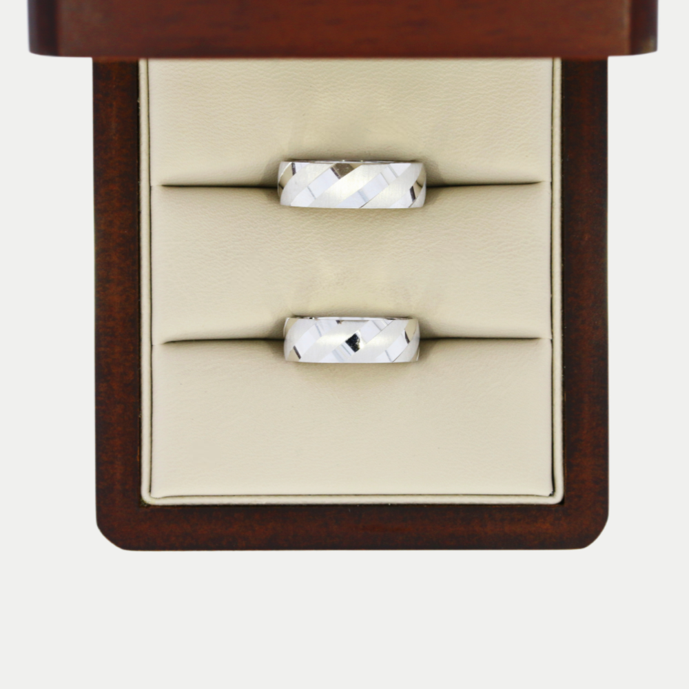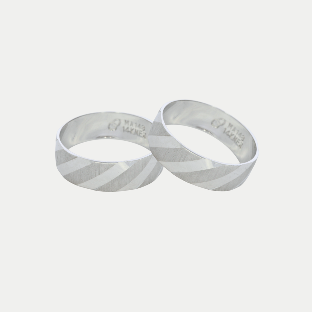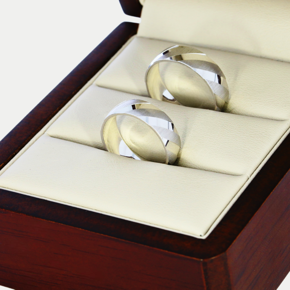 Hechas en oro blanco acabado satinado con líneas lisas al rededor del anillo, realizamos el grabado de nombre y fecha (letras y números) por la parte de adentro sin costo adicional. Ancho del anillo: 6mm Precio aplica para par con medidas 6.0 y 10.0. Mandar mensaje por WhatsApp para cotizar en diferentes medidas (tiene un costo extra cuando sumando las medidas de los dos anillos da un total de 16 puntos en adelante). Tiempo de preparación de los anillos: 20 días hábiles aproximadamente, mas el tiempo de entrega de paquetería que es de 2 - 5 días hábiles aproximadamente.
