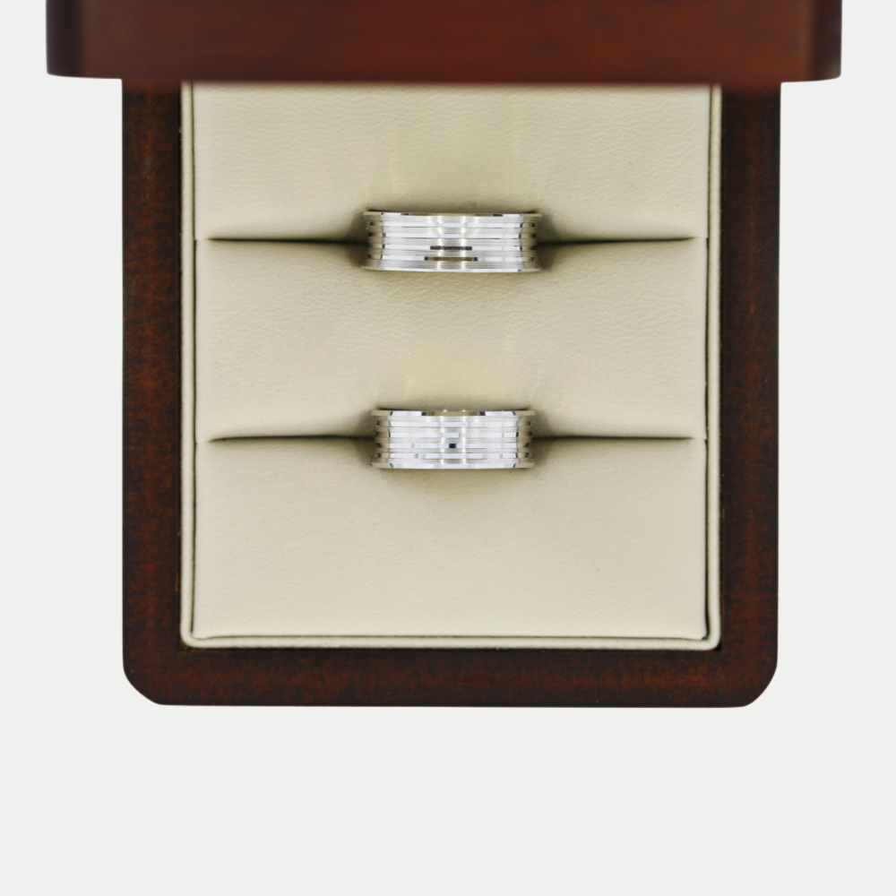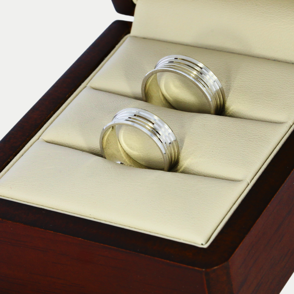 Hechas en oro blanco con tallado lineal brillante, el cuerpo del anillo es recto por la parte de adentro y por fuera tiene una curvatura hacia adentro, realizamos el grabado de nombre y fecha (letras y números) por la parte de adentro sin costo adicional. Ancho del anillo: 6mm Precio aplica para par con medidas 6.0 y 10.0. Mandar mensaje por WhatsApp para cotizar en diferentes medidas (tiene un costo extra cuando sumando las medidas de los dos anillos da un total de 16 puntos en adelante). Tiempo de preparación de los anillos: 20 días hábiles aproximadamente, mas el tiempo de entrega de paquetería que es de 2 - 5 días hábiles aproximadamente.